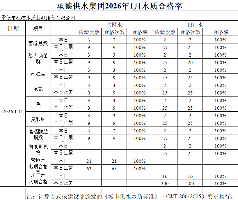 承德供水集团2026年1月11日水质合格率